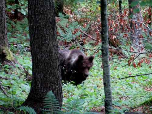 Sur la piste, nous croisons des chevreuils et au détour d'un virage, une ourse au milieu de la piste, dressée sur ses deux pattes arrière, se tient là devant nous. Elle traverse et se fige dans les buissons à quelques mètres dans le contrebas.
