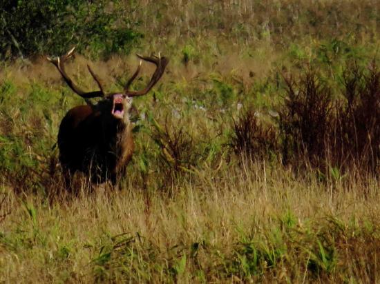 Nous nous dépêchons de rejoindre notre point stratégique. Notre place d’affût d'hier matin ! Nous y parvenons juste avant le lever du soleil : rien a priori. Puis, un raire à coté de nous dans la plaine, c'est le même cerf qu'hier qui n’arrêtait pas de bramer.