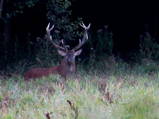 Sur notre gauche retentit un raire, un autre cerf fait son apparition, celui-ci est dans la force de l'age, il est vraiment splendide ! Il reste sur la lisière et brame à plusieurs reprises, puis il rentrera de nouveau à couvert.