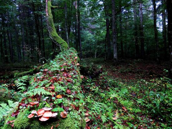 Après cette rencontre avec les cerfs, nous sommes de nouveau à couvert sous la voûte de la canopée, là même où les rayons de lumière ne pénètrent que lorsque qu'un de ces arbres tricentenaire est abattu par la foudre ou autre incident naturel... Le sous-bois est magnifique, les arbres s'élèvent à plus de 35 mètres, voire plus de 40 mètres, telles des cathédrales. Nous avons l'impression qu'ils touchent les cieux. Des gélinotte s'envolent à notre passage, nous observons un pic tridactyle mâle, puis une femelle.
